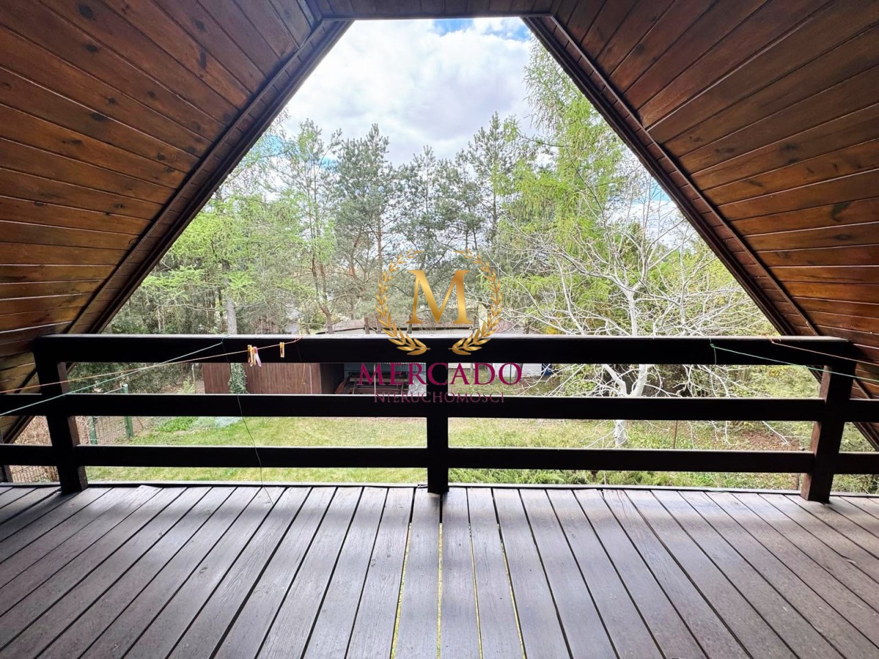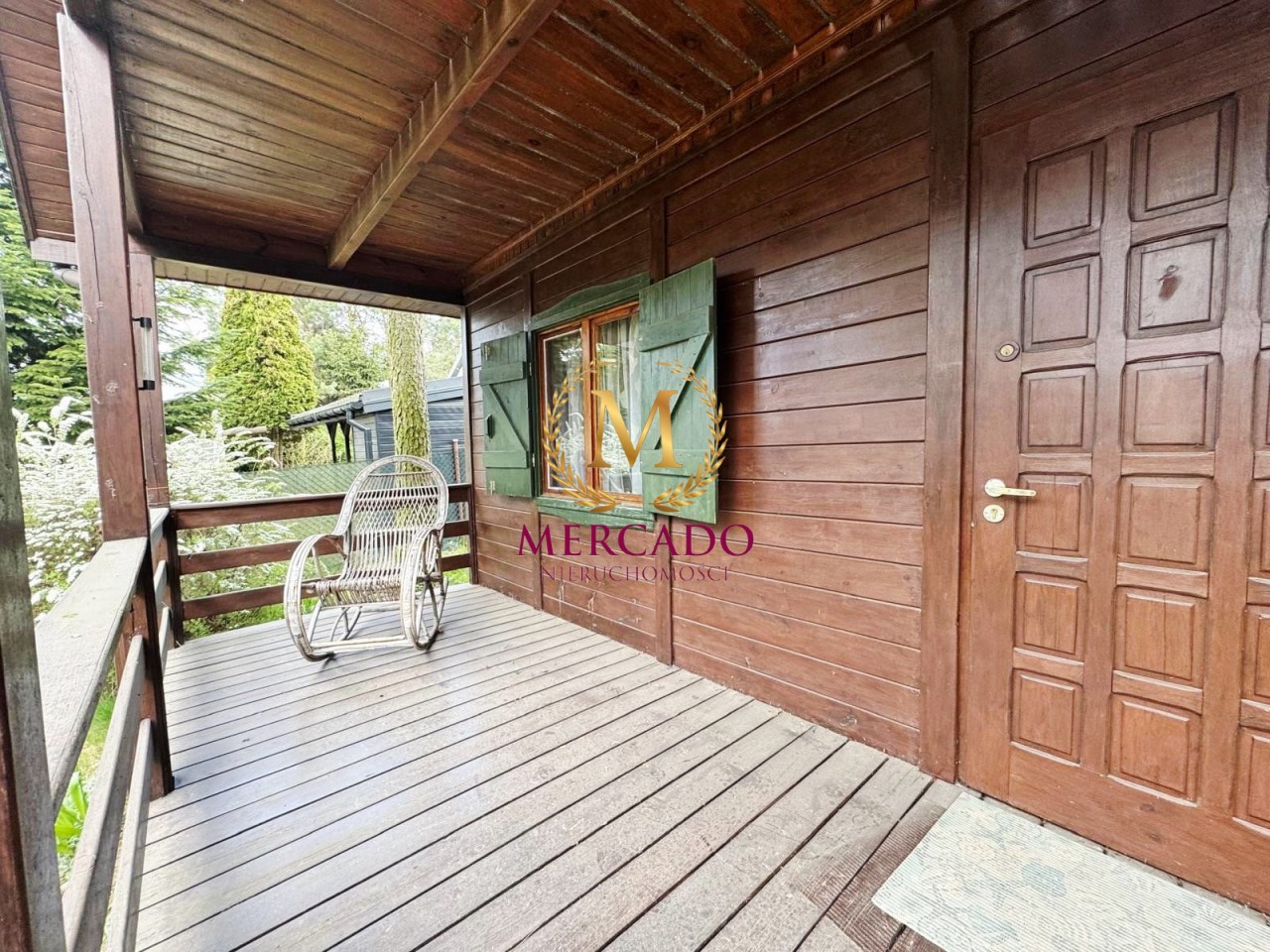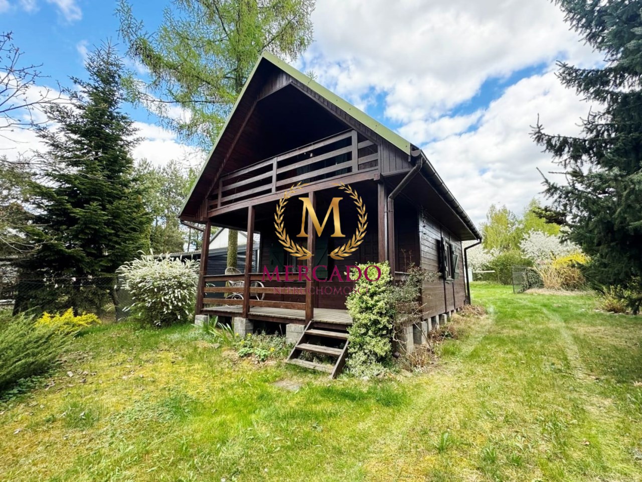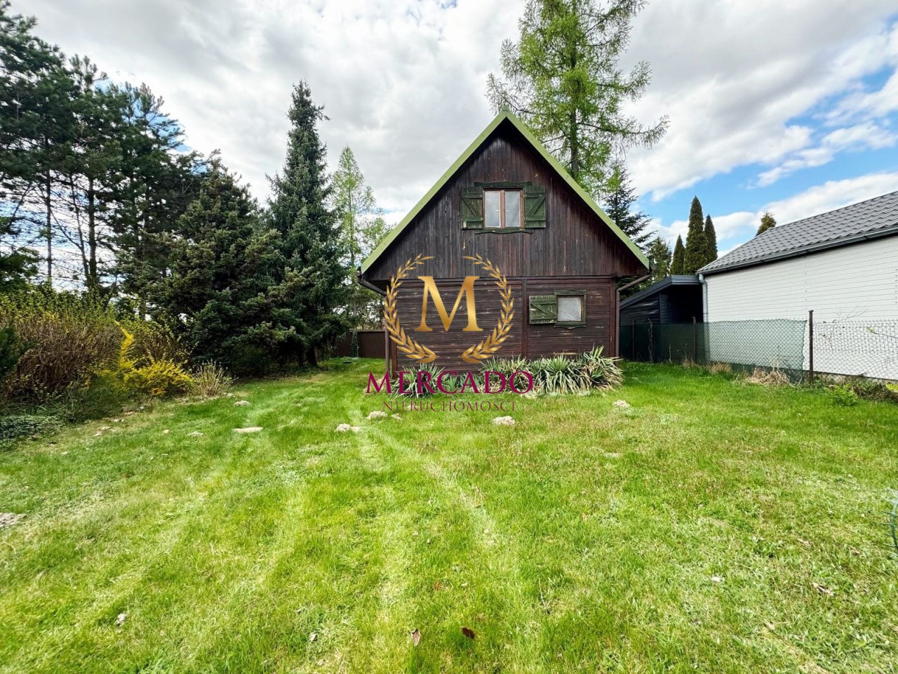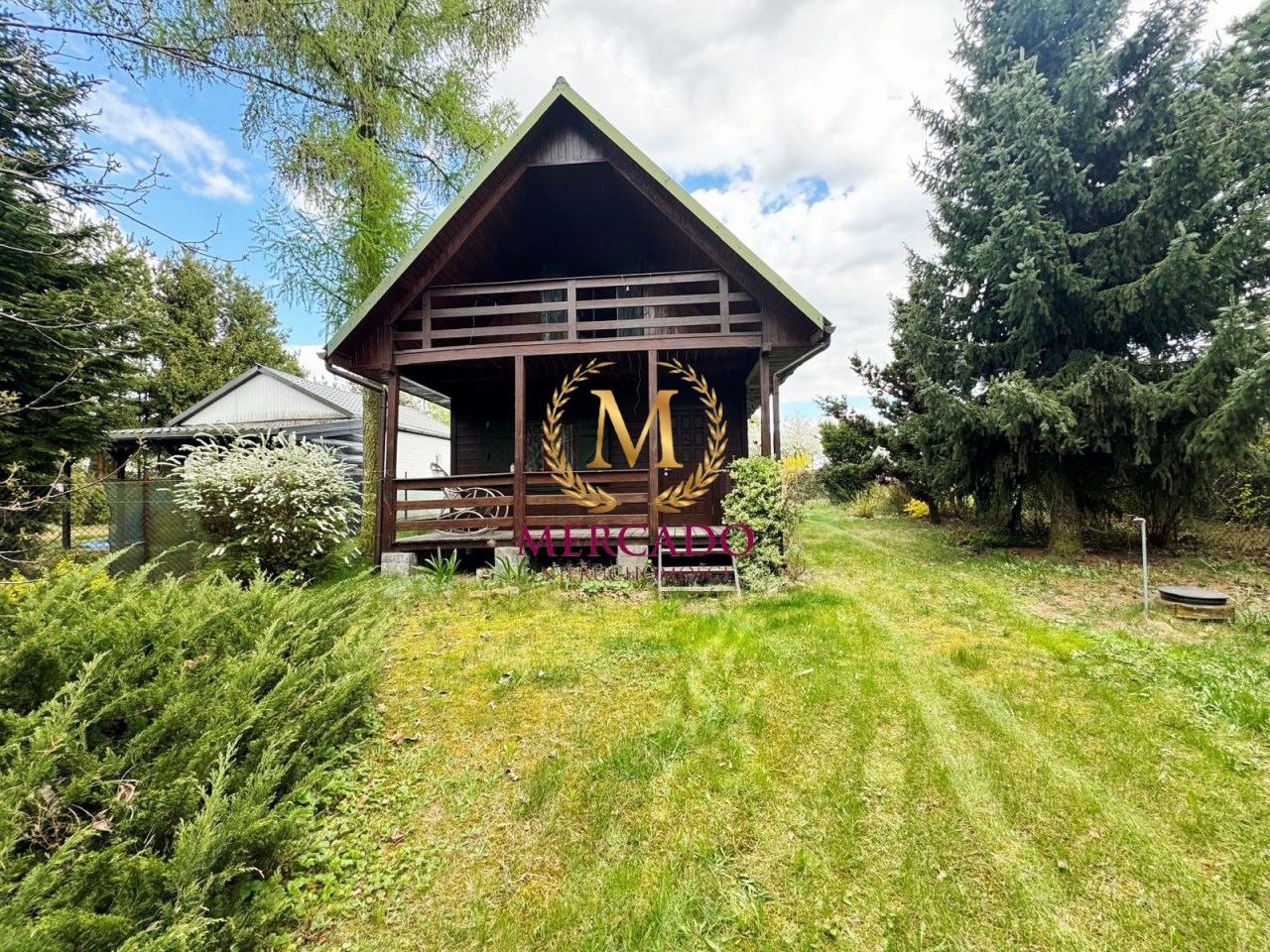 Działka o powierzchni 500m2, zabudowana drewnianym domkiem z poddaszem o łącznej pow. 60m2 wraz z tarasem i balkonem (20m2), oraz wiatą ze schowkiem na narzędzia.