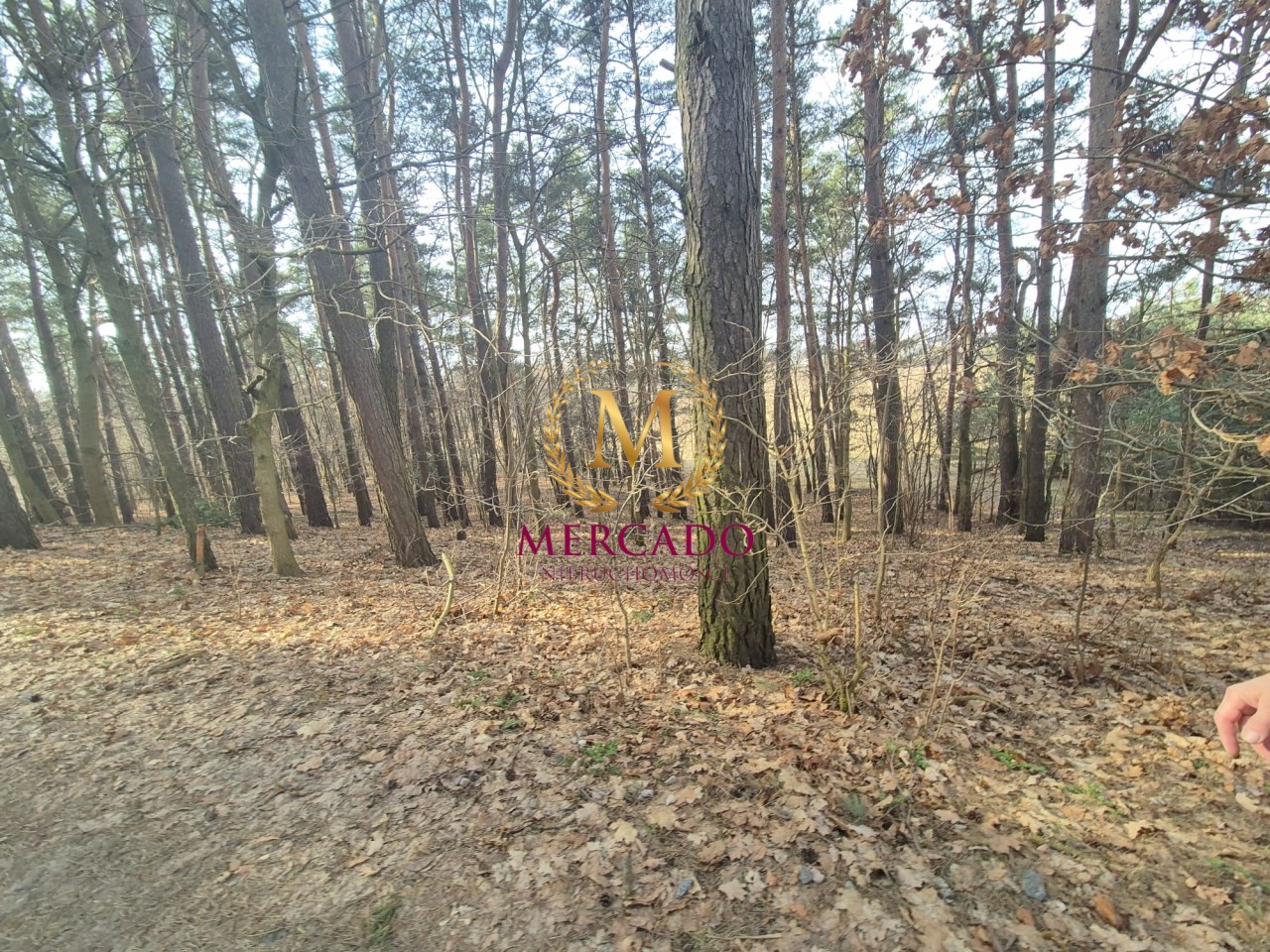 Pierwsza z działek jest porośnięta wysokimi drzewami na terenie pochyłym w kierunku kolejnych.