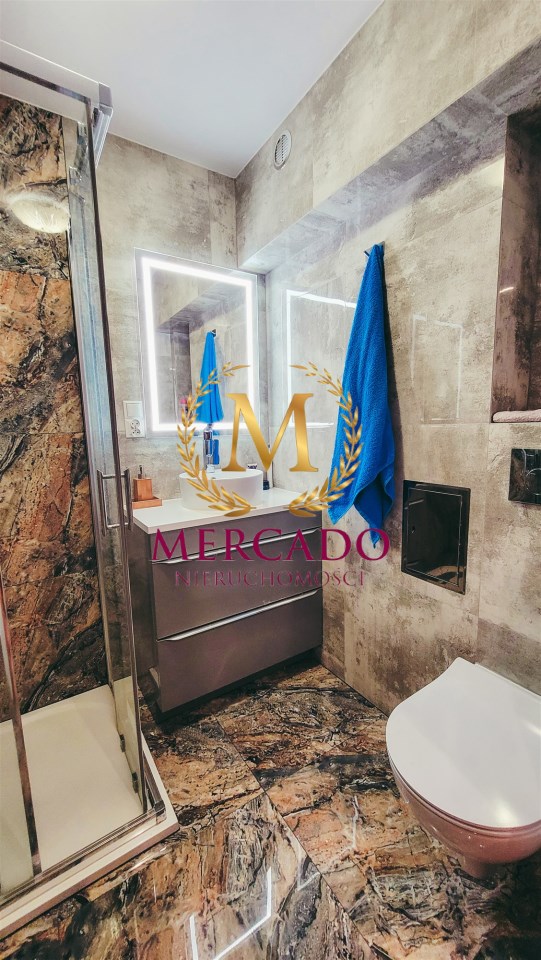 Podłoga sypialni w drewnie, w kuchni, łazience oraz przedpokoju terakota. Ściany w gładziach. Łazienka po remoncie, kuchnia z zabudową; zabudowa kuchni i przedpokoju mogą pozostać w cenie. Klimatyczne świetlenie LED w pokoju.