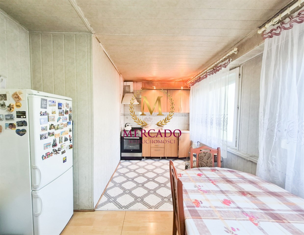 - Widna kuchnia z oknem i dużą częścią jadalnianą.