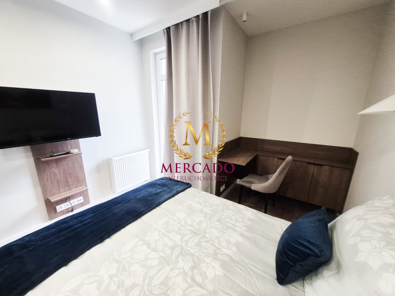 - sypialnia z podwójnym łóżkiem i szafkami nocnymi oraz miejscem do pracy,